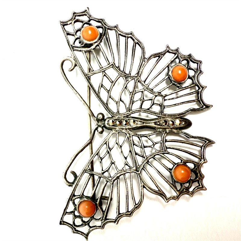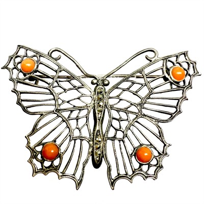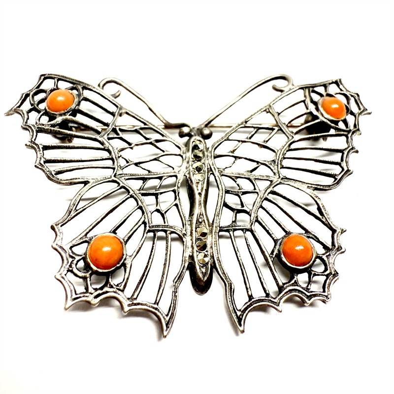 Jemná, velmi půvabná brož znázorňující motýla. Šperk byl zhotoven ze sterlingového stříbra (925/1000) o celkové váze 5,22 g. Rozměry 5 x 3 cm. Brož zdobí čtyři korály lososového odstínu a řada markazitů. Výborný stav.