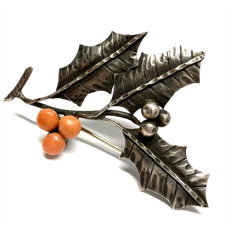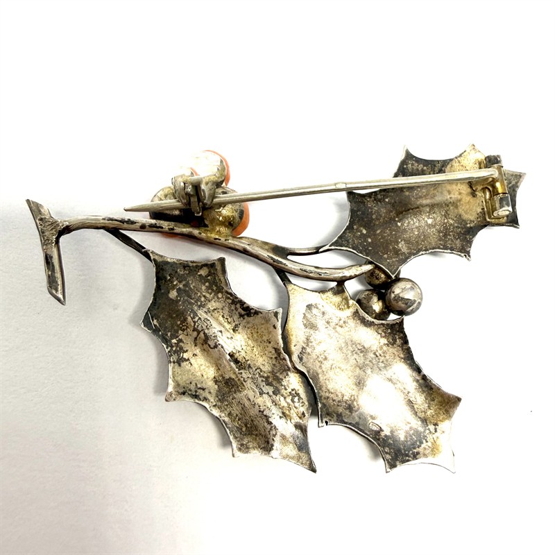 Originální, velmi půvabná stříbrná brož - větévka cesmíny. Brož byla zhotovena ze stříbra sterlingové ryzosti (925/1000). Jehla obecný kov. Celková váha 6,91 g. Šperk mimo nevšední formy samotné zdobí tři korály sytého lososovitého odstínu. Rozměry cca 5 x 3 cm. Výborný stav.