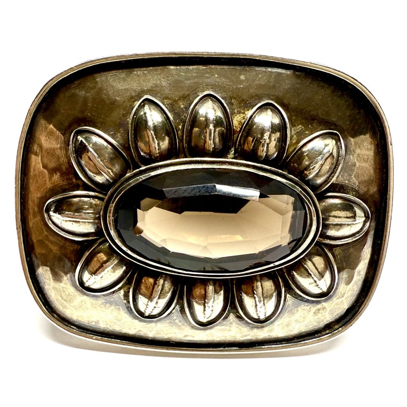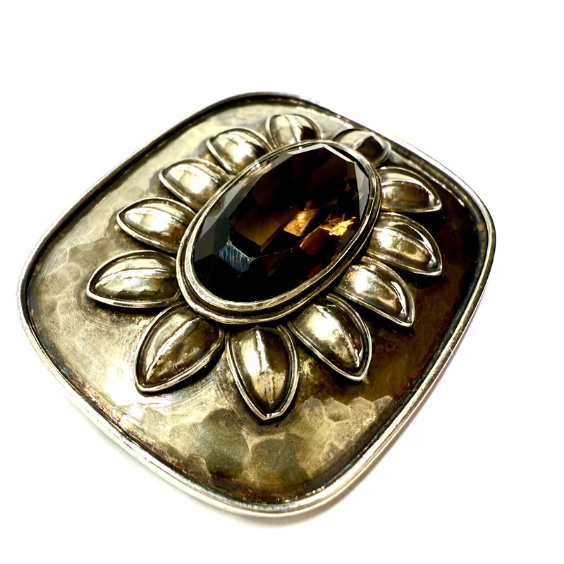 Originální, výrazná brož vyrobená ze stříbra v první polovině 20.století ve šperkařské manufaktuře Perli. Šperku dominuje tmavě hnědý, kouřový topaz vsazený jako střed plastického florálního motivu. Stříbro ryzosti 835/1000, celková váha 10,17 g. Rozměry cca 4 x 3 cm. Značeno. Perfektní stav.