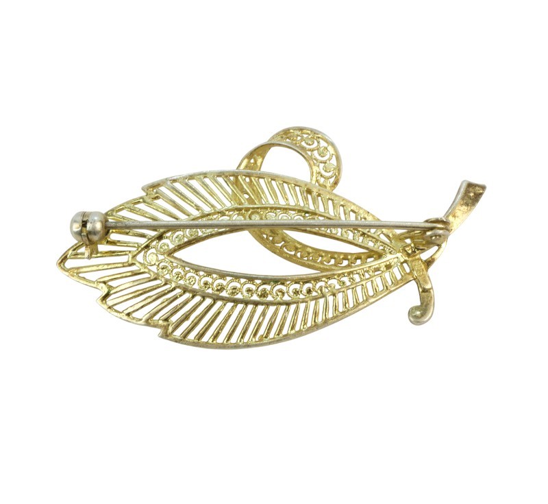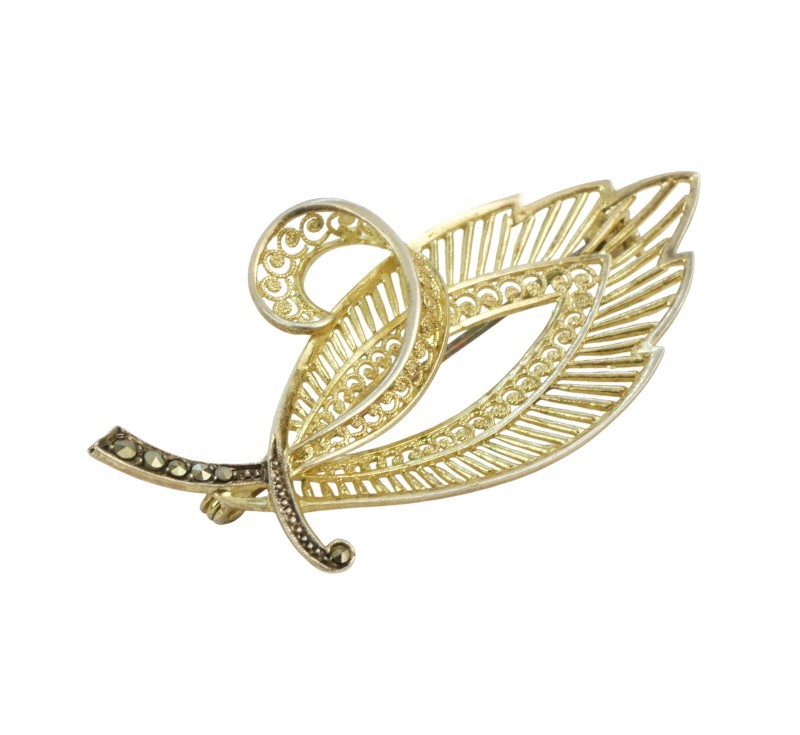 Pozlacená stříbrná brož ve tvaru lístku ryzosti 800/1000 zdobená markazity. Zavírací jehla je z obecného kovu. Rozměry brože jsou 5,4 x 2,8 cm. Celková hmotnost 4,76 g.