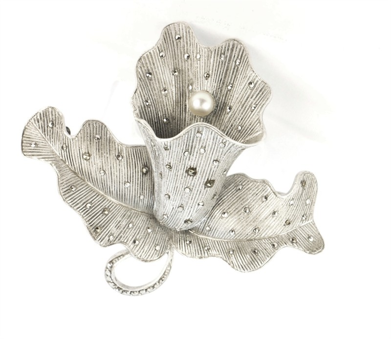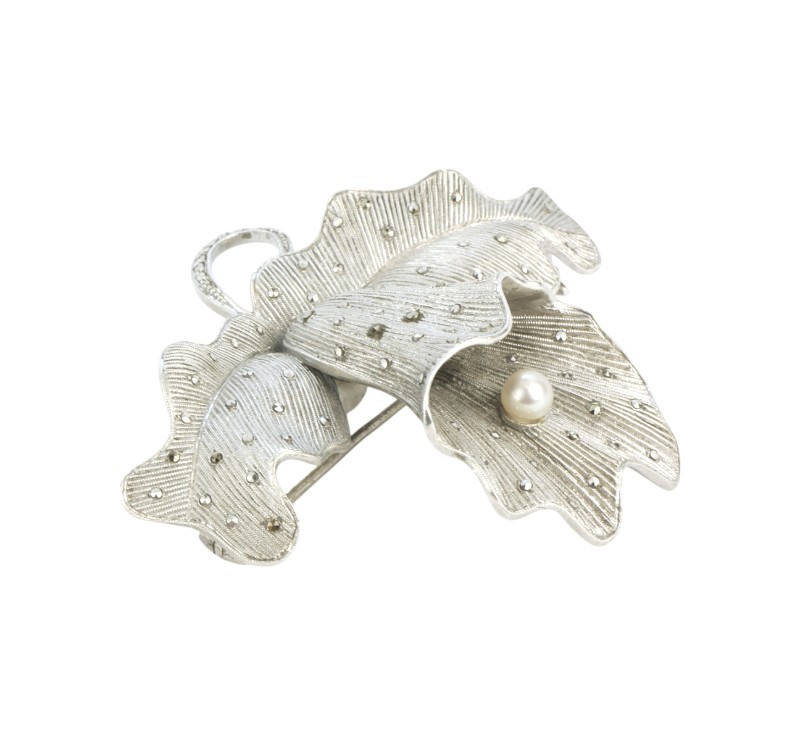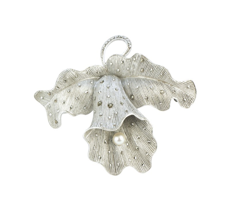 Brož vyrobená ze stříbra ryzosti 925/1000 zdobená markazity z dílny věhlasného šperkaře Theodora Fahrnera. Rozměry 4,7 x 5,5 cm. Celková hmotnost 16,14 g.