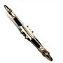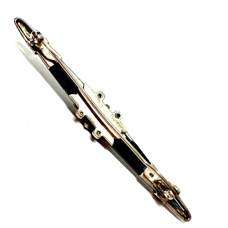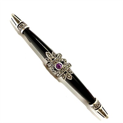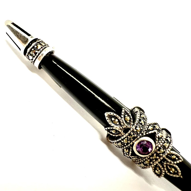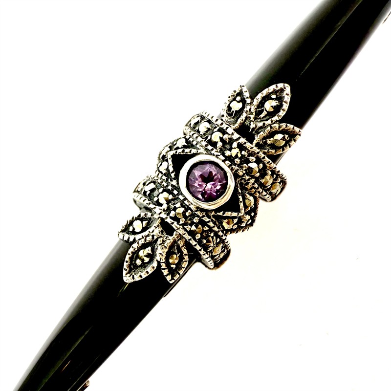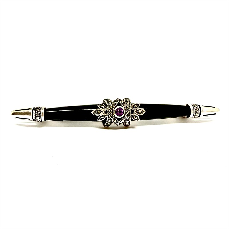 Elegantní, nevšední, podlouhlá brož. Šperk byl zhotovený ze sterlingového stříbra (925/1000), o váze 10,04 g. Zdobí jej velký černý onyx, drobné elegantně se třpytící markazity a středový ametyst. Délka 8 cm. Perfektní stav.