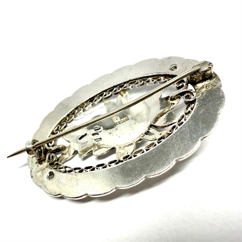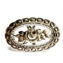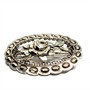 Malebná, stříbrná brož s plasticky vyvedeným motivem růže. Šperk byl vyroben ze stříbra ryzosti 800/1000, o celkové váze 8,78 g. Střed zdoben granátem. Délka cca 4,5 cm. Profesionálně vyčištěno, výborný stav.