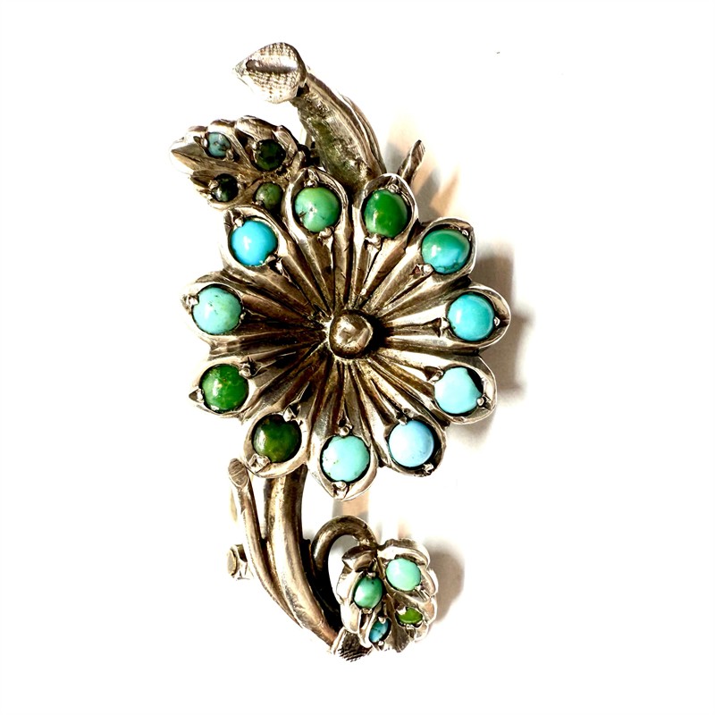 Stříbrná brož s tyrkysy - květina