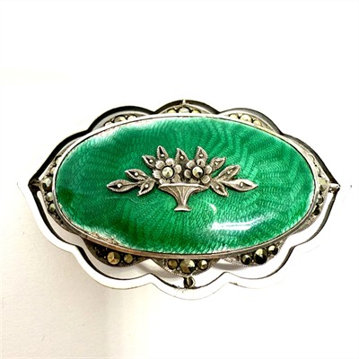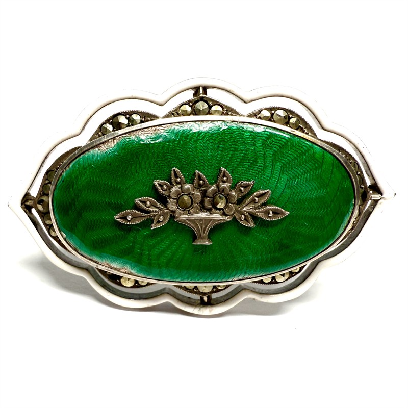 Malebná, stříbrná brož zdobená smalty. Šperk zdobí půvabný, plastický košík ozdobený elegantními markazity. Šperk byl vyroben ze sterlingového stříbra (925/1000) počátkem 20.století. Celková váha 12,57 g. Rozměry cca 5 x 3 cm. Při krajích drobné poškození zeleného smaltu, při nošení velmi málo viditelné, výrazně zohledněno v ceně.