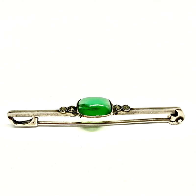 Jemná, decentní stříbrná brož z období první republiky. Šperk je osazen tmavě zeleným chalcedonem, který byl decentně dozdoben elegantně se třpytícími markazity. Sterlingové stříbro (925/1000), celková váha 2,23 g. Délka 5 cm. Perfektní stav.