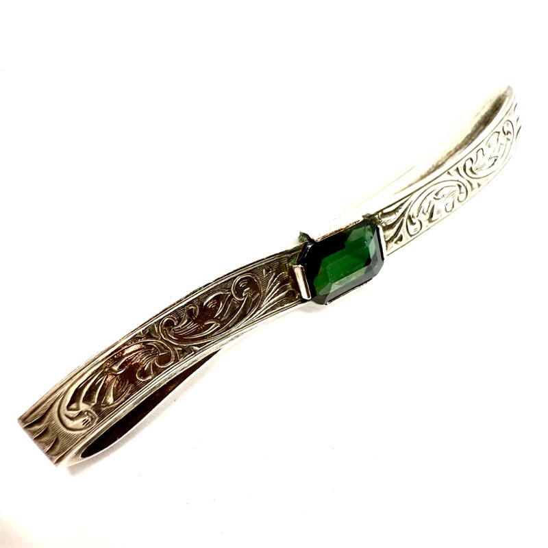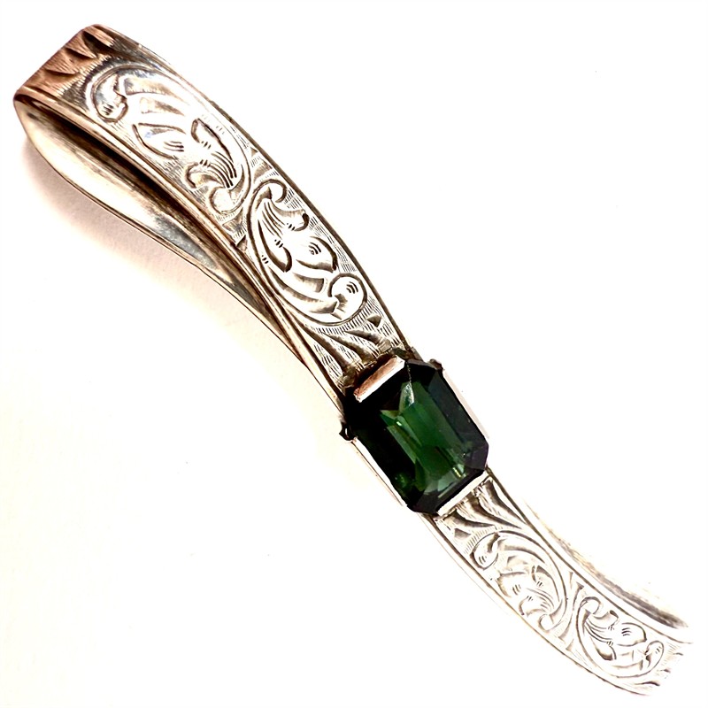 Elegantní stříbrná brož. Šperk je osazený fazetově broušeným, temně zeleným spinelem a ručním rytím. Byl vyroben v první polovině 20.století ze sterlingového stříbra (925/1000), o celkové váze 9,08 g. Rozměry cca 6 x 0,8 cm. Brož byla vyčištěna zlatníkem a je v perfektním stavu.