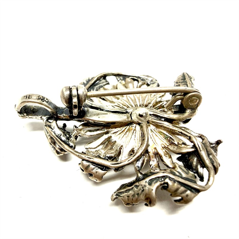 Velmi půvabná, stříbrná brož, která díky závěsnému očku může být užíván jako závěs. Šperk byl zhotoven ve skotské šperkové manufaktuře Hardy brothers. Stříbro ryzosti 835/1000, celková váha 8,33 g. Značeno autorskou, ryzostní a puncovní značkou. Rozměry 3 x 2,5 cm. Perfektní stav.