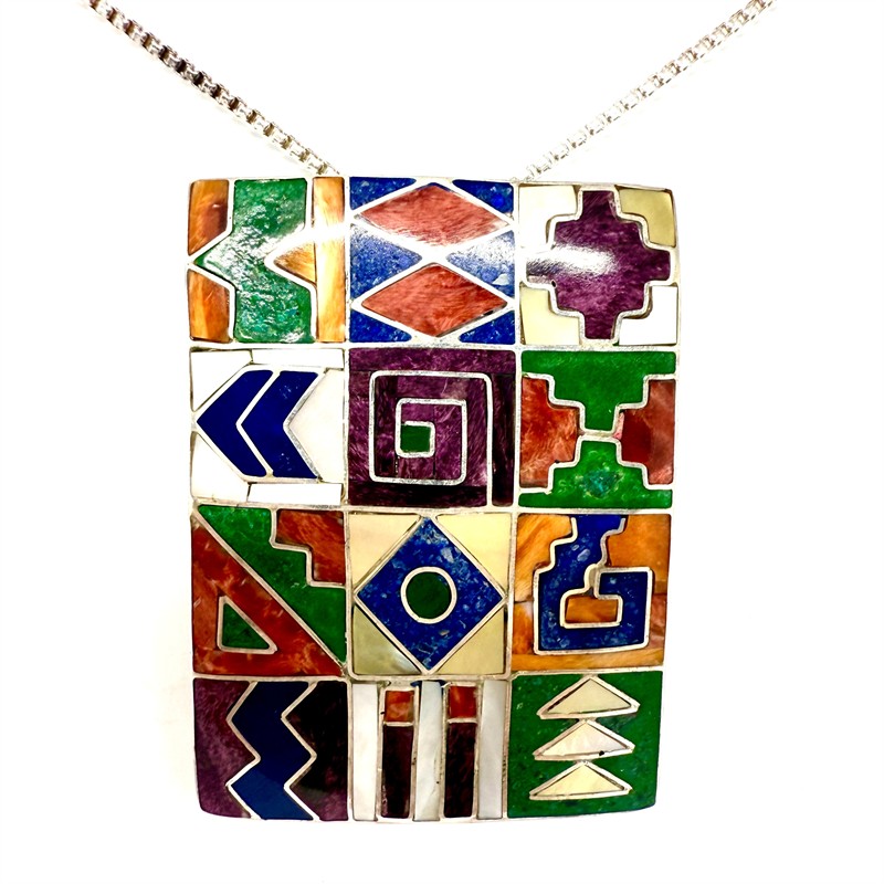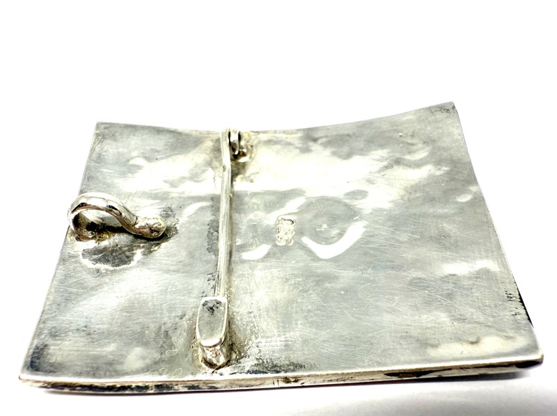 Výrazná brož jež může být po zavěšení na řetízek užívána i jako závěs. Šperk byl zhotoven z téměř ryzího stříbra (950/1000), o celkové váze 19,44 g. Zdobeno celoplošnou mozaikou z perleti a drahých kamenů. Rozměry 5 x 3,5 cm. Výborný stav. Řetízek není součástí prodeje.