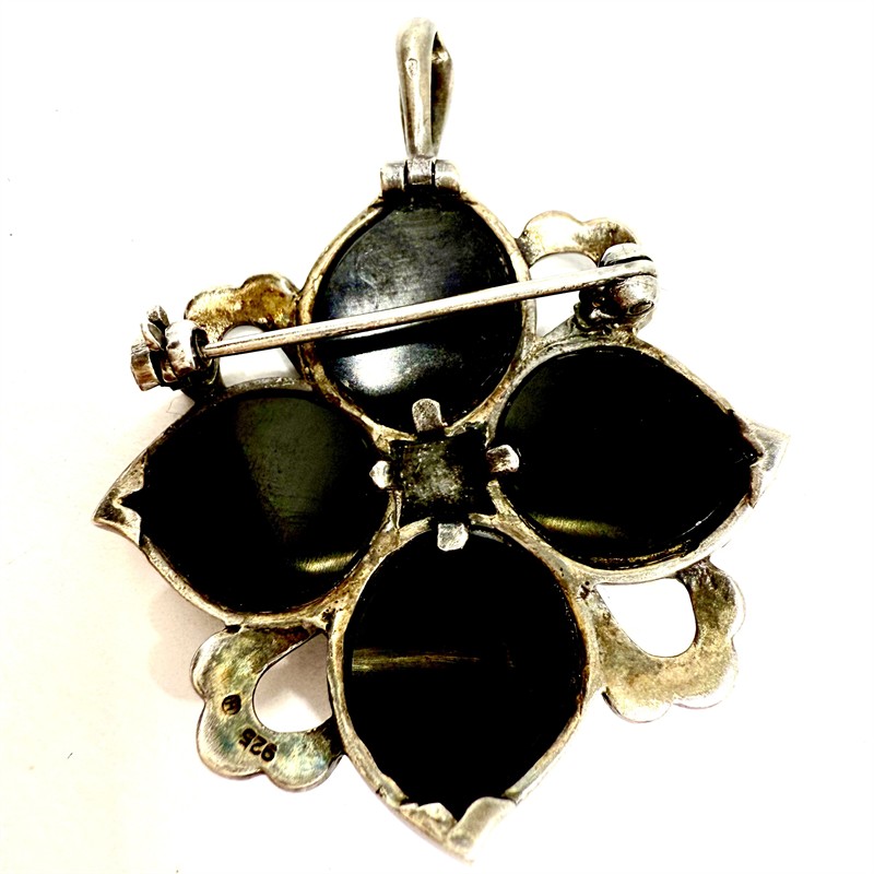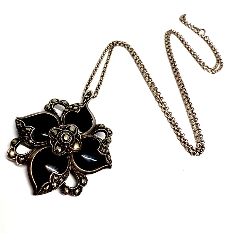 Stříbrná brož / závěs s onyxy a markazity - květina