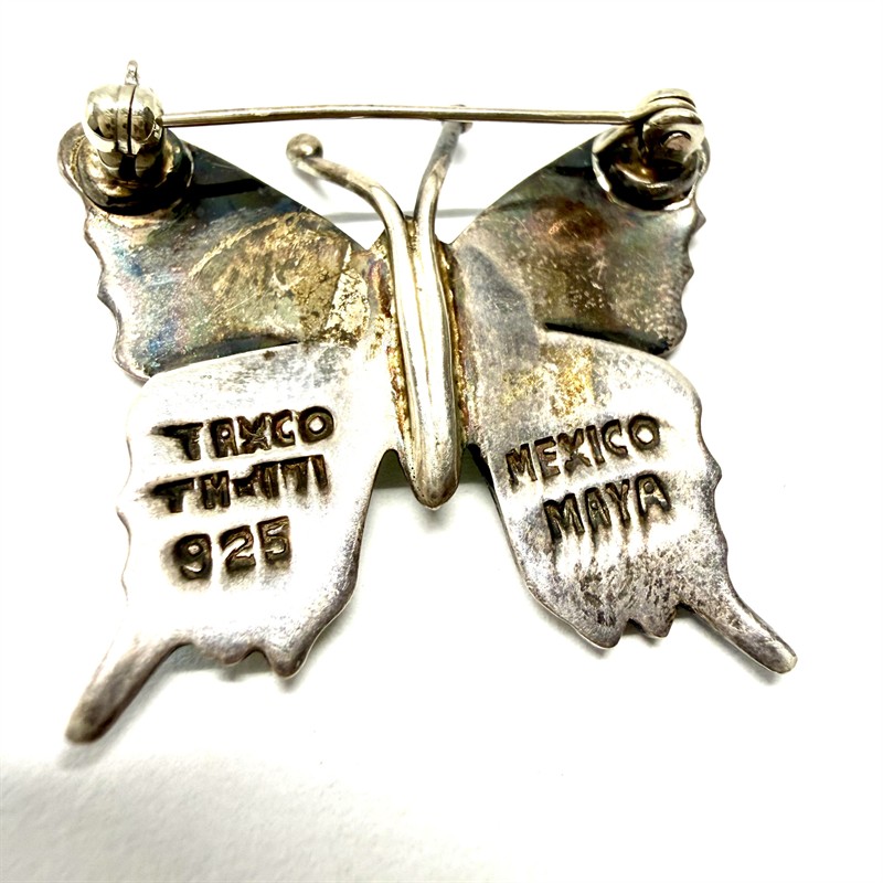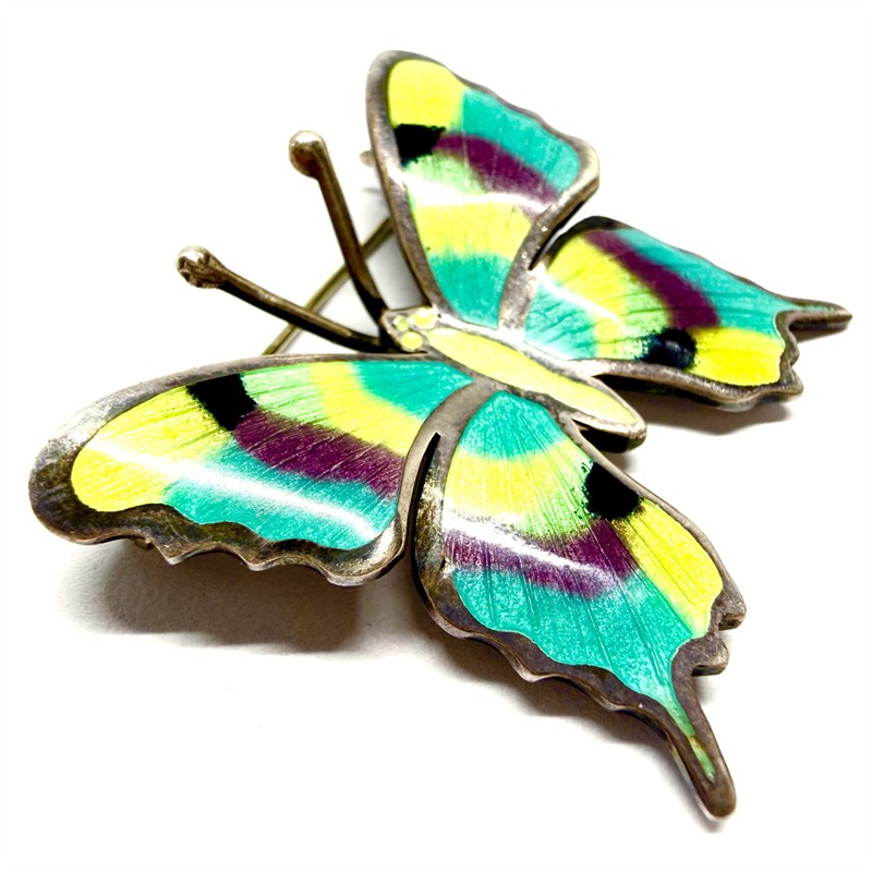 Půvabná stříbrná brož, celoplošně zdobena barevnými smalty - motýl. Šperk byl zhotoven v Mexiku v 70. letech minulého století ze sterlingového stříbra (925/1000). Uzávěr obecný kov. Celková váha 8,17 g. Rozměry cca 3 x 3 cm. Perfektní stav.