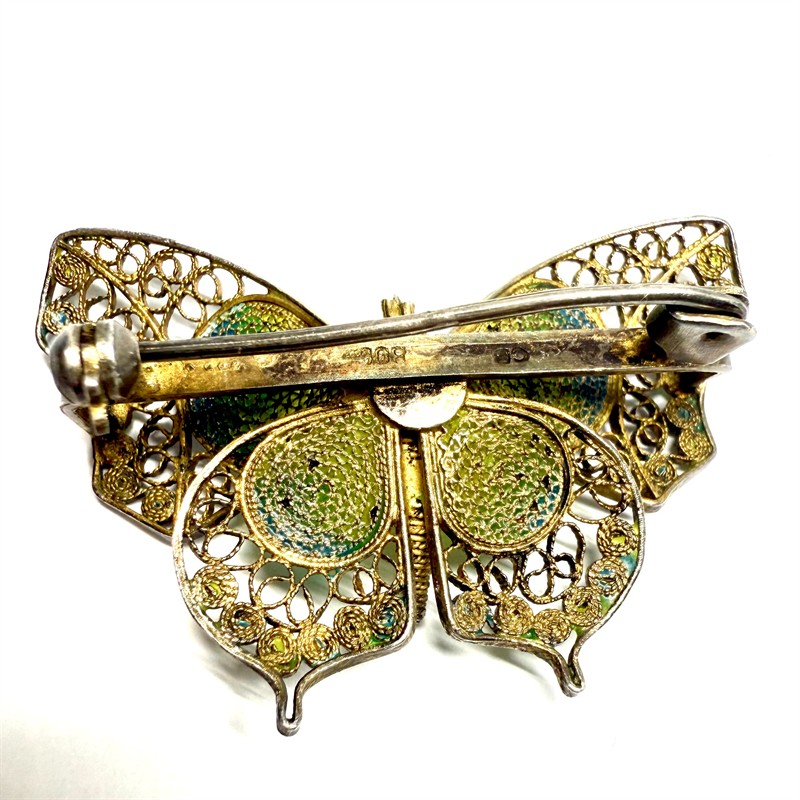 Půvabná, stříbrná brož - motýl. Brož byla vyrobena ze stříbra ryzosti 800/1000 a je zdoben pracnou ruční technikou filigránu a dvoubarevného smaltu. Rozměr 4 x 2 cm. Celková váha 5,98 g. Značeno ryzostní, autorskou a puncovní značkou. Velmi dobrý stav.