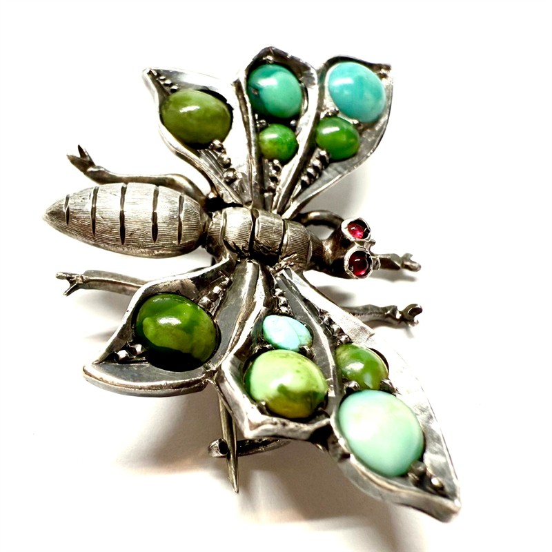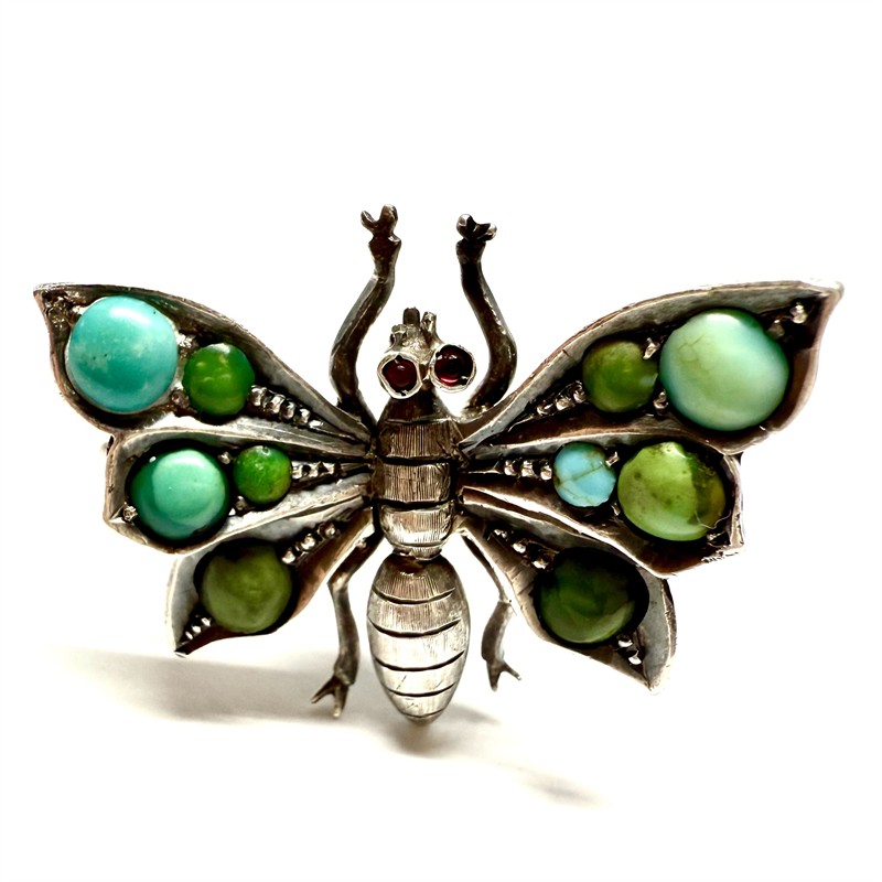 Půvabná, velmi stará, výrazná brož - motýl. Šperk zdobí přírodní tyrkysy v místě křídel a dva drobné almandiny na místě očí. Šperk byl zhotoven ze stříbra ryzosti 800/1000, o celkové váze 7,30 g. Jehla z obecného kovu. K broži je vyhotoveno osvědčení Puncovního úřadu. Rozměry 3,5 x 2,5 cm. Výborný stav.