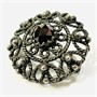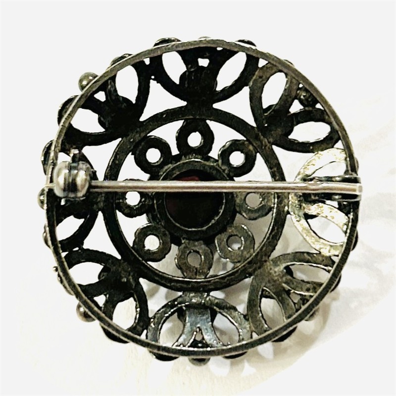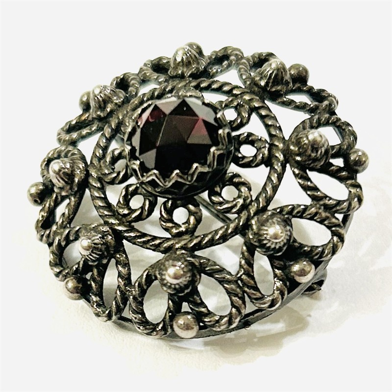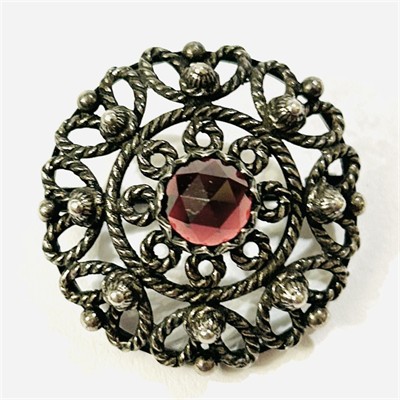 Honosná, kulatá brož osazena ve středu přírodním granátem kulatého routového brusu, prořezávané ornamentální tělo z křivek připomínající techniku filigránu, doplněno o vystupující granulované kuličky. Designem napodobující německý lidový šperk 18. a 19. století, německá zlatnická práce z poslední pětiny 20. století. Zhotoveno z nezlaceného, umělé patinovaného stříbra o ryzosti 925/1000; nově označeno pucem S-61 (kozlík 2) na jehle. Hmotnost 7,31 g, průměr 29 mm. Zapínání včetně pojistky v pořádku, celkově ve velmi zachovalém stavu.