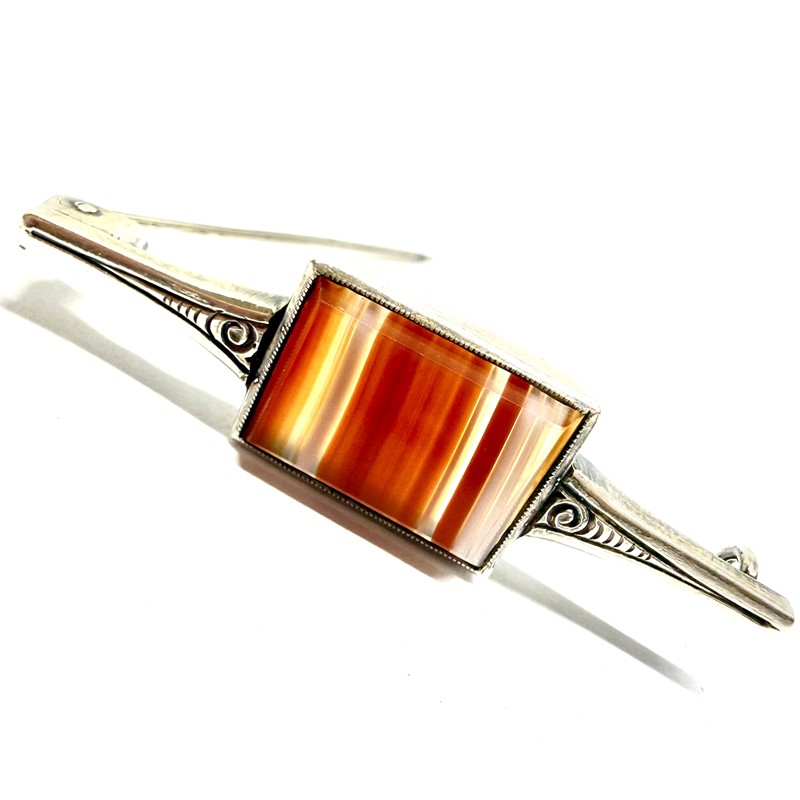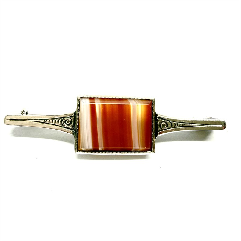 Decentní, drobnější, nadčasově pojatá brož. Šperk byl zhotoven ze stříbra ryzosti 800/1000, v období první republiky. Zdobí jej destička přírodního achátu s krásnými hnědými odstíny. Celková váha 5,65 g. Délka 5 cm. Starý, osobitý šperk v perfektním stavu.