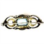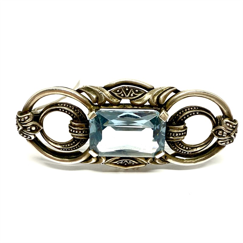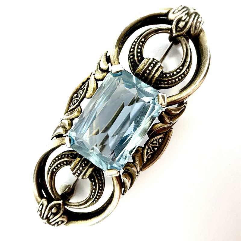 Elegantní, stříbrná brož z období první republiky. Šperk byl zhotoven ze stříbra ryzosti 835/1000, zdobí jej fazetově vybroušený, blankytně modrý spinel. Celková váha 11,27 g. Ke šperku je vyhotoveno osvědčení Puncovního úřadu. Rozměry cca 5 x 2 cm. Perfektní stav.