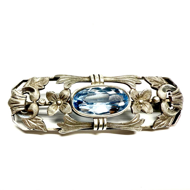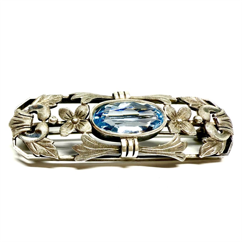 Elegantní brož zhotovená ze stříbra v první polovině 20.století. Šperk je osazen modrým spinelem fazetového brusu a zdobí jej malebný florální motiv. Stříbro ryzosti 835/1000, celková váha 8,79 g. Rozměry 5,3 x 1,5 cm. Perfektní stav.