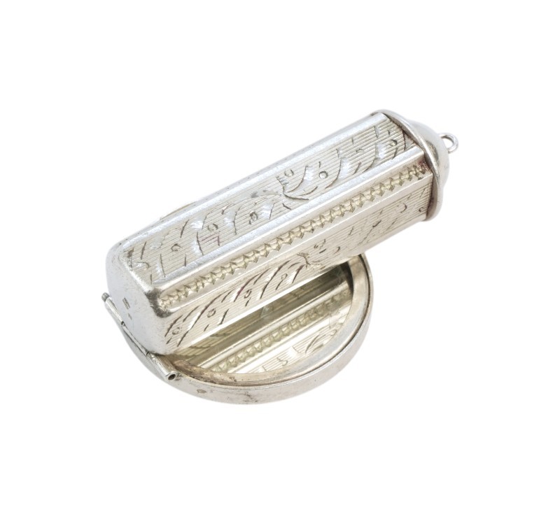 Půvabné kapesní pouzdro na rtěnku s kulatým zrcátkem, ze stříbra ryzosti 900/1000. Rozměry: průměr obalu na rtěnku 1,2 cm, výška 5,5 cm, průměr zrcátka 3,5 cm. Celková hmotnost 34,90 g.