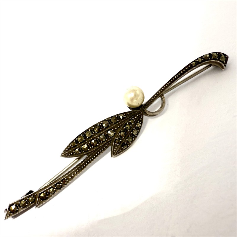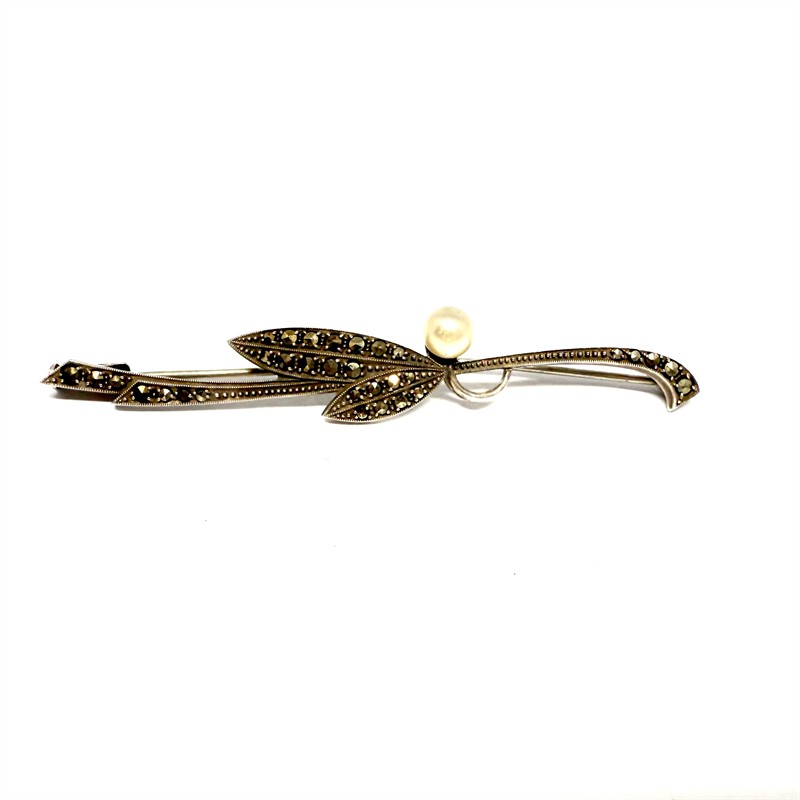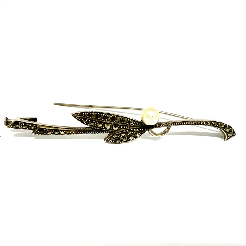 Elegantní, půvabná stříbrná brož. Šperk byl zhotoven v secesním duchu v první polovině 20. století. Zdobí jej bílá perla, kontrastně dozdobená elegantními markazity. Stříbro ryzosti 935/1000, jehla obecný kov. Celková váha 5,16 g. Délka 7cm. Výborný stav.