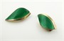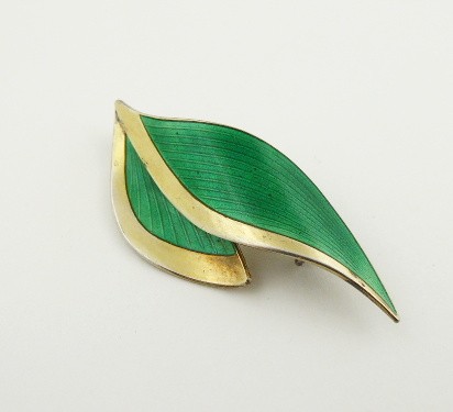 Stříbro, zelený email, kov. Autor: slavný skandinávský stříbrník Albert Scharning (1875-1950). Ryzost Ag 925/1000, celková hmotnost 15,27 g. Přiloženo osvědčení Puncovního úřadu České republiky. Designová souprava ze stříbra vysoké ryzosti v podobě brože a náušnic stylizovaných do podobenství prohnutých lístečků s vroubkováním. Ručně barevně dekorováno zeleným emailem. Zapínání náušnic na klapky. Jehla u brože a klapky (klipsy) u náušnic z obecného kovu. Značeno: mistrovská značka, ryzost 925 a STERLING, NORWAY. Norsko, Molde, 40. až 50. léta minulého století. Rozměr brože 60 mm x 30 mm. Rozměr náušnic 30 mm x 15 mm.