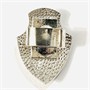 Moderní spona na šátek ve tvaru štítu, ve středu osazeno oválnou muglí přírodního heliotropu, zdobeno vinutým gravírováním připomínající cestu ze stop. Nápaditá tuzemská zlatnická práce z první pětiny 21. století. Zhotoveno z nezlaceného stříbra o ryzosti 925/1000; punc S-61 (kozlík 2), ryzostní číslo a mistrovská značka "BEN" na průvleku. Hmotnost 7,30 g, délka 32,5 mm, šířka 23,5 mm, délka průvleku 16,5 mm. V novém, tedy nenošeném stavu.