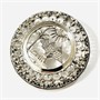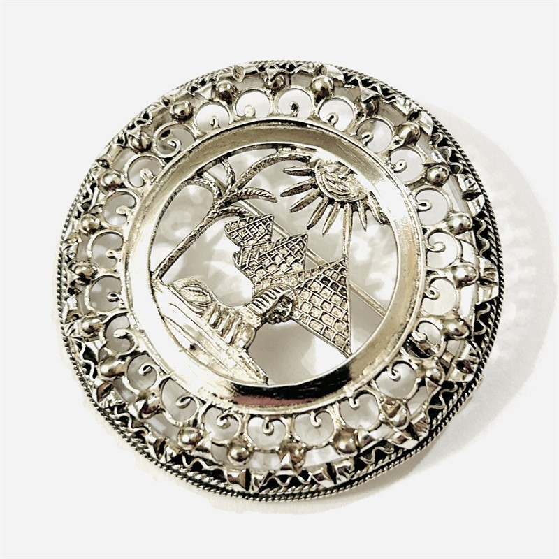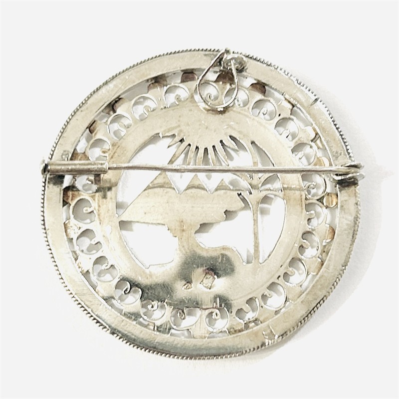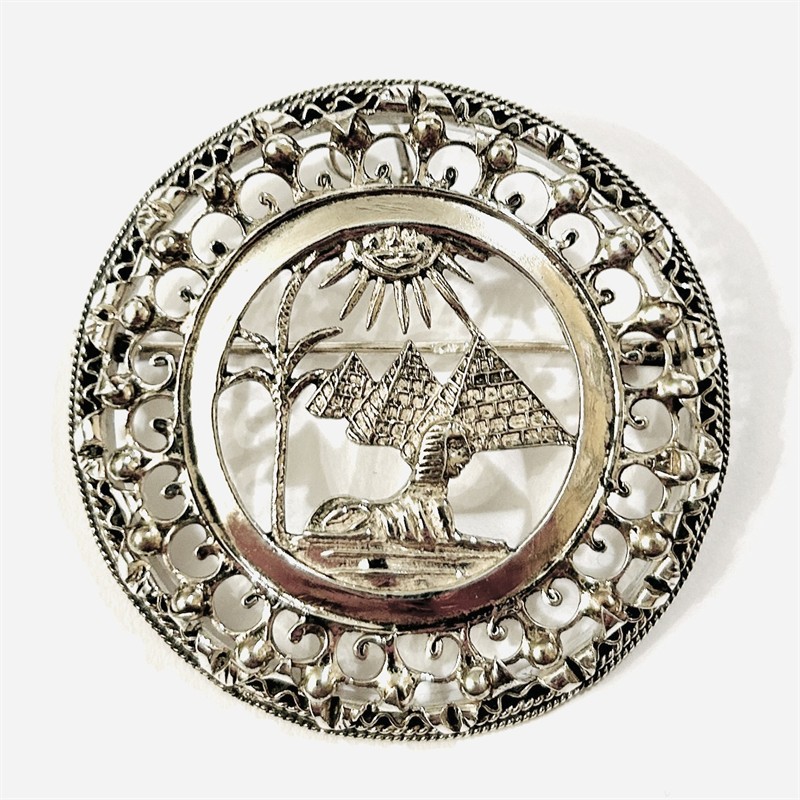 Větší kulatá brož/přívěšek s ústředními egyptskými motivy (pyramidy v Gíze, Sfinga, palma s zářivé slunce), dekorativní bohatě prořezávaný rámeček, při kraji obkrouženo pletenci. Nevšední upomínkový šperk, kvalitní egyptská šperkařská práce z 2. třetiny 20. století, dovezeno na naše území ve stejném období. Zhotoveno z nezlaceného stříbra o ryzosti 800/1000; československý dovozový punc S-43 (lilie s Č) zezadu, egyptské puncy též. zepředu a na jehle. Hmotnost 15,73 g, průměr 41,5 mm. Zapínání včetně trombónové pojistky v pořádku. Ve velmi zachovalém stavu, odborně vyčištěno a vyleštěno zlatníkem.