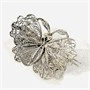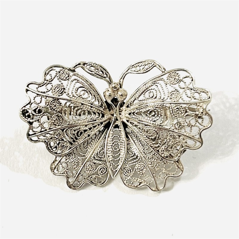 Dekorativní brož ve tvaru motýla, vyplněno jemnými filigránovými volutami a doplněno granulovanými kuličkami. Elegantní a hravý šperk, precizní, patrně německá (Schwäbisch Gmünd) práce ze 2. třetiny 20. století. Zhotoveno z nezlaceného stříbra o ryzosti 800/1000; nově opatřeno puncem S-69 (zajíc 5) a ryzostní číslo zespoda. Hmotnost 3,33 g, délka 31 mm, šířka 22 mm. Zapínání na "C" sponu v pořádku, otevřená jehla přirozeně volná, ponecháno s jemnou přirozenou patinou, celkově ve velmi zachovalém stavu.