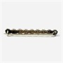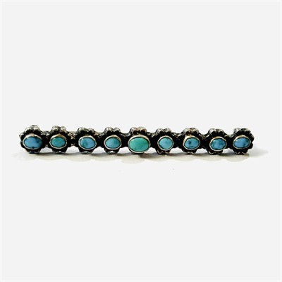 Elegantní, podlouhlá brož osazena v řadě 9 oválnými muglemi přírodního tyrkysu, prostřední lehce větší, fasováno v hladkých obrubách s květinovými rámečky, zadní strana zdobena ornamentálním rytím. Typická sedmihradská zlatnická práce z poslední třetiny 19. století. Zhotoveno z nezlaceného stříbra o ryzosti 750/1000; rakousko-uherský punc S-34 (lev 4) s písmenem "P" (značící budapešťský puncovní úřad) a ryzostní číslo na sponě a jehle. Hmotnost 3,78 g, délka 47 mm, šířka 5,5 mm. Zapínání na "C" sponu v pořádku, ponecháno s přirozenou patinou (podtrhující estetiku šperku), lze vyčistit. Zezadu a na jehle velmi lehké zbytky zlacení, celkově ve velmi zachovalém stavu. Největší rozmach sedmihradských šperků v poslední třetině 19. století, typické pro své novorenesanční, méně i novobarokní tvarosloví. Vynikají vysokou úrovní ručního zpracovaní, nejčastěji zhotovovány ve stříbře a osazeny přírodními kameny a perlami.