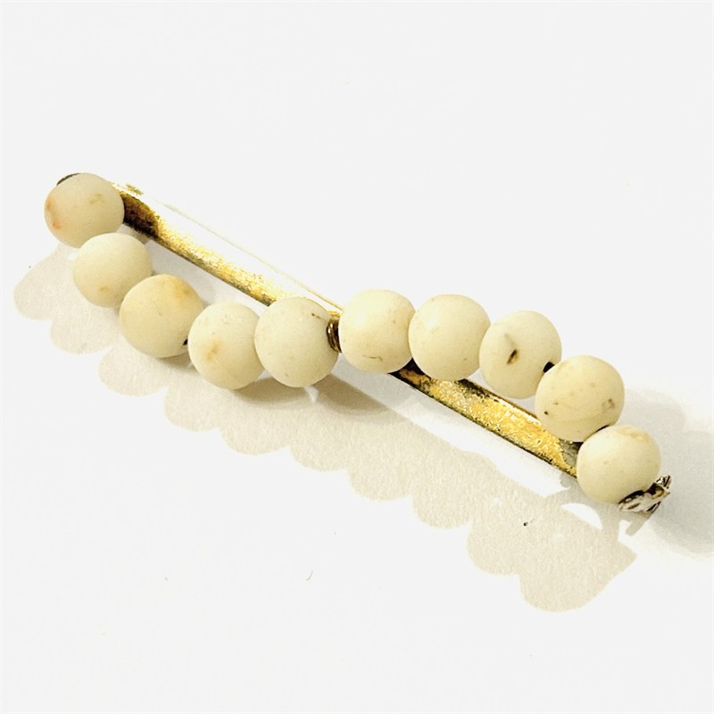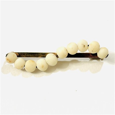 Elegantní, nadčasová brož z období art-deco, ryze geometrická kompozice z linie kovu s protínající zvlněnou křivkou z navlečených přírodních mořských bílých korálů. Kvalitní středoevropská zlatnická práce z 30. let 20. století. Zhotoveno ze zlaceného stříbra o ryzosti 925/1000; nově opatřeno puncem S-61 (kozlík 2) zespoda. Hmotnost 5,63 g, délka 51 mm, šířka 17 mm. Zapínání včetně trombónové pojistky v pořádku. Ponecháno s přirozenou patinou, lze vyčistit, zlacení lehce setřené, korály s matným povrchem, celkově v zachovalém stavu.
