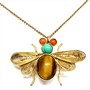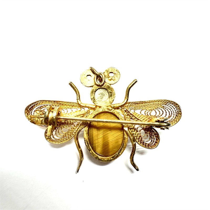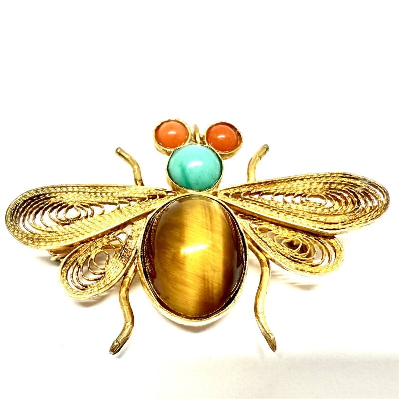 Hravá, drobnější brož, jež může po zavěšení na řetízek sloužit jako závěs. Šperk byl zhotoven ze zlaceného stříbra ryzosti 800/1000, o celkové váze 3,40 g. Šperk zdobí korály, tyrkys a tygří oko. Křídla zhotovena technikou filigránu. Rozměry cca 3,5 x 2,5 cm. Velmi dobry stav.