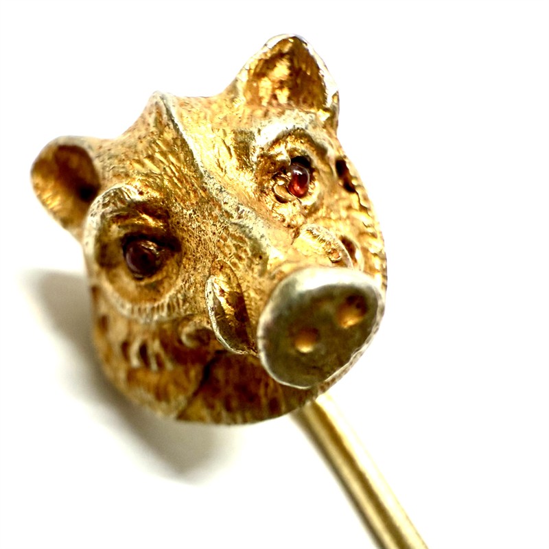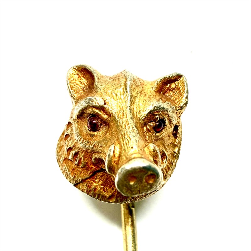 Velmi stará, nevšední jehlice. Šperk zdobí miniaturní, věrně ztvárněná hlava divočáka. Stříbro ryzosti 750/1000, celková váha 4,83 g. Značeno starým, dobovým puncem - hlava lvice. Výborný stav.
