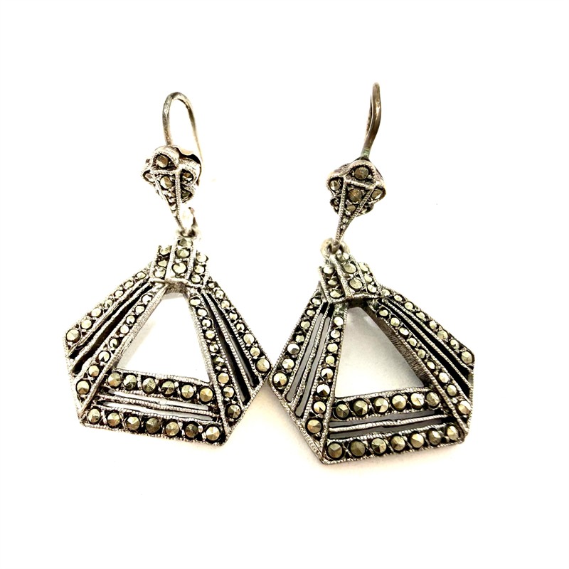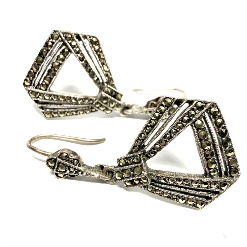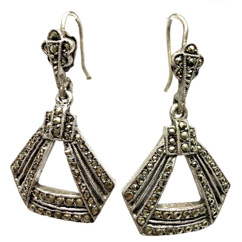 Půvabné, elegantní, závěsné náušnice zhotovené ve stylu Art deco v první polovině 20.století. Zhotoveny ze stříbra ryzosti 935/1000, o celkové váze 4,91 g. Náušnice zdobí velké množství velmi drobných, elegantně se třpytících markazitů. Délka 3,5 cm. Výborný stav. Jedná se o skutečně staré šperky, nikoliv současnou napodobeninu.