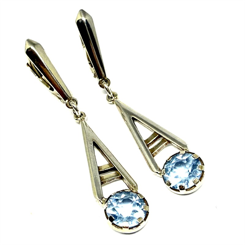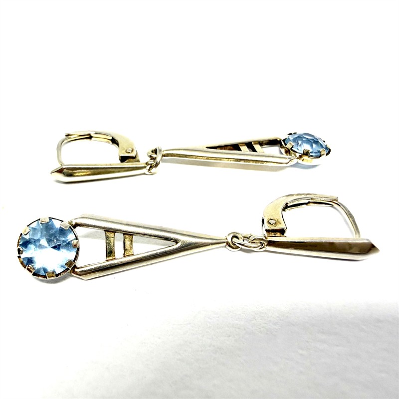 Půvabné, závěsné náušnice zhotovené v první polovině 20.století ve stylu Art deco. Náušnice zdobí světle modrý spinel. Zhotoveny ze stříbra sterlingové ryzosti (925/1000), o celkové váze 2,96 g. Délka cca 4 cm. Profesionálně vyčištěno. Půvabný, příjemně nositelný šperk vhodný k dennímu užití i na slavnostní příležitost. Výborný stav.