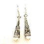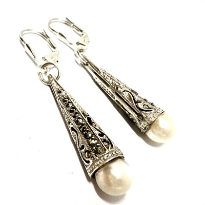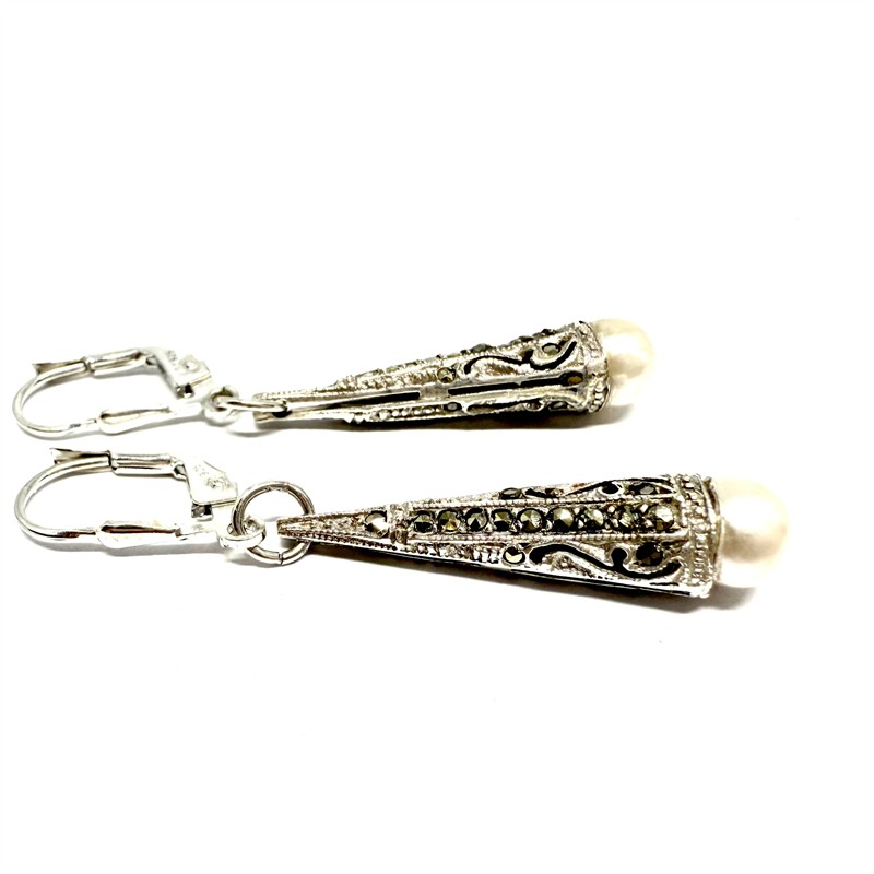Půvabné závěsné náušnice zhotovené ve stylu Art deco. Sterlingové stříbro (925/1000), celková váha 5,57 g. Náušnice zdobí sněhobílá perla a elegantně se třpytící markazity. Délka 4,5 cm. Čištěno zlatníkem, výborný stav.