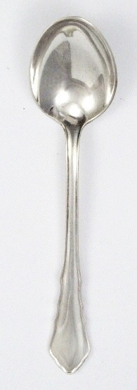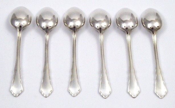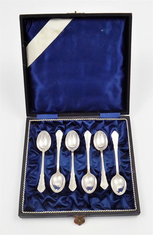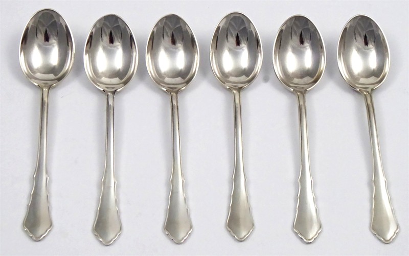 Stříbro. Ryzost Ag 800/1000, celková hmotnost 114,7 g. Výrobce: Sandrik, Dolné Hámre. Stříbrné lžičky pro 6 osob zdobené vysoce elegantní reliéfní linkou při okrajích. Ve výborném stavu. V originální etui se zdobným kovovým uzávěrem a vyložené modrou látkou. Značeno: nově označeno platným českým puncem, ryzost 800 a značka výrobce. Slovensko, Dolné Hámre, 40. léta minulého století. Délka lžiček 11,5 cm.