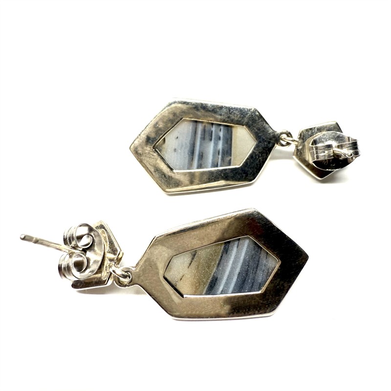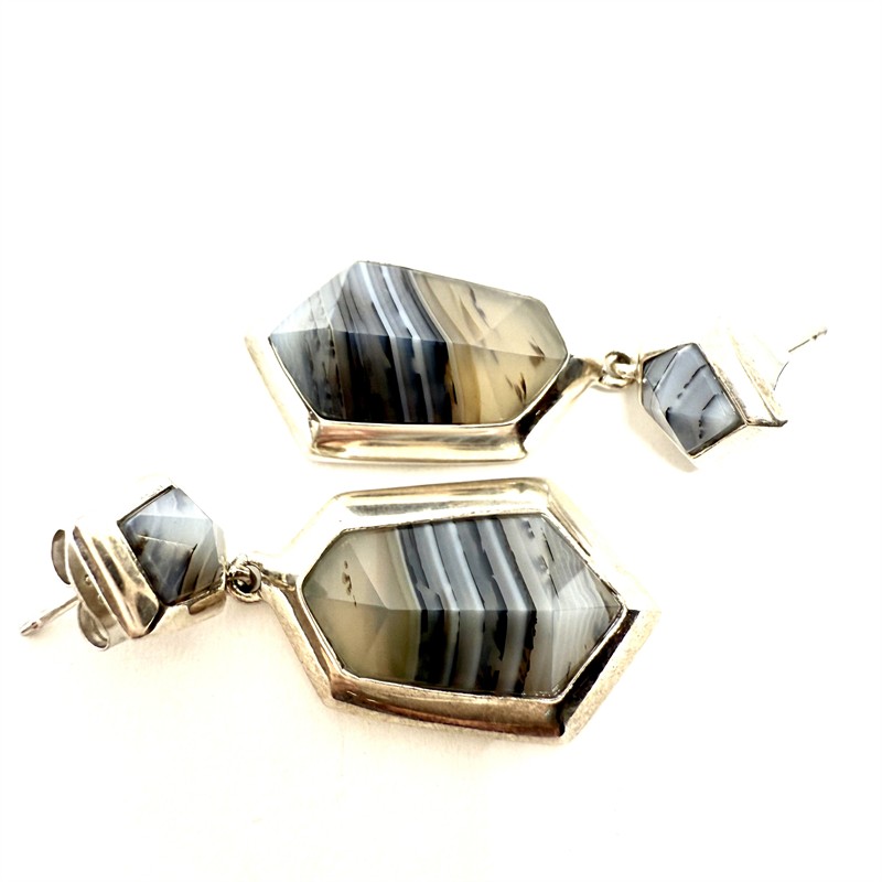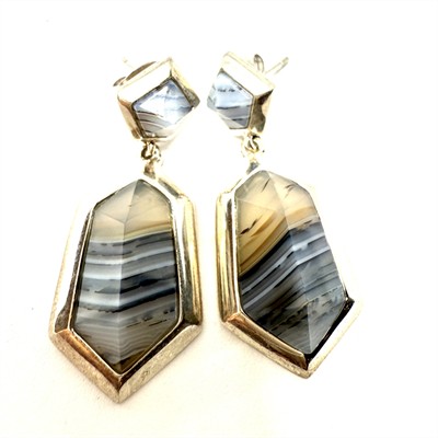 Výrazné stříbrné náušnice se zapínáním na puzetu. Patrná inspirace kubismem. Náušnice zdobí šedohnědý achát s krásnou kresbou. Celková váha 9,49 g. Sterlingové stříbro (925/1000). Perfektní stav.