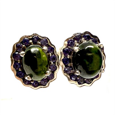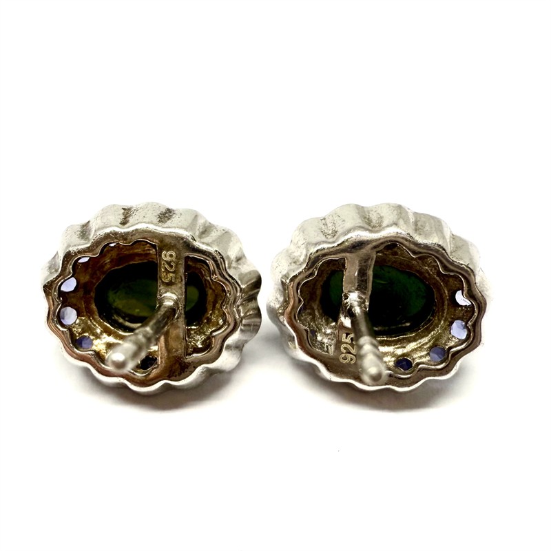 Výrazné, přesto elegantní stříbrné náušnice se zapínáním na puzetu. Náušnice jsou osazeny tmavě zeleným chromdiopsidem pocházejícím ze Sibiře. Ten kontrastně rámují drobné, ostře fialové cordierity. Náušnice byly zhotoveny ze sterlingového stříbra (925/1000),o celkové váze 4,14 g. Rozměr 7 x 10 mm. Velmi málo nošeno, perfektní stav.