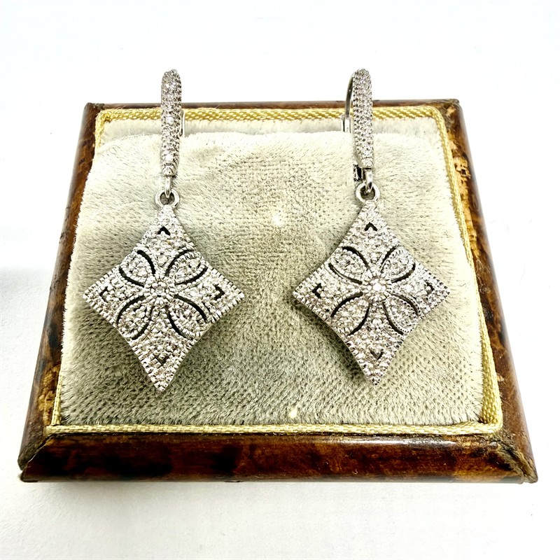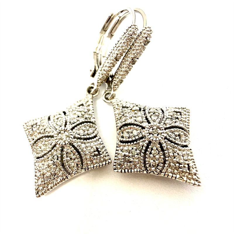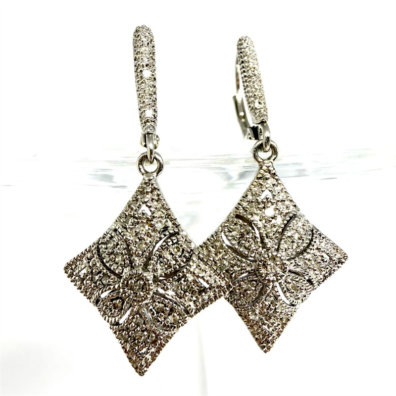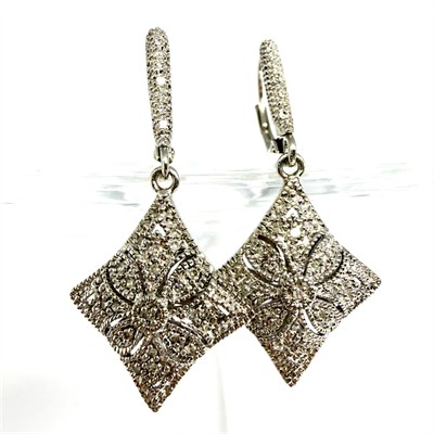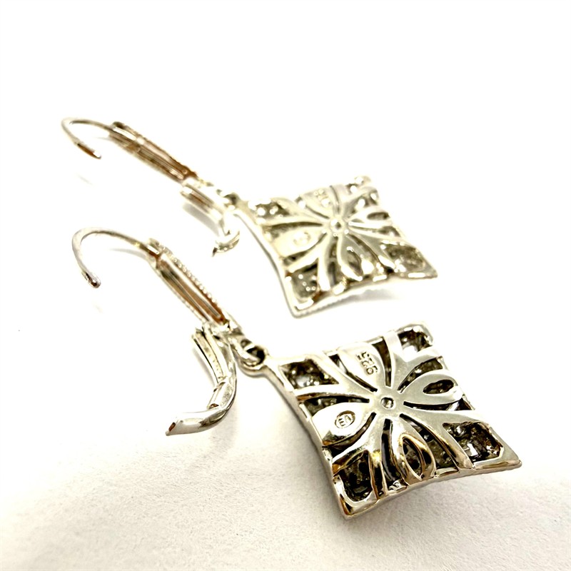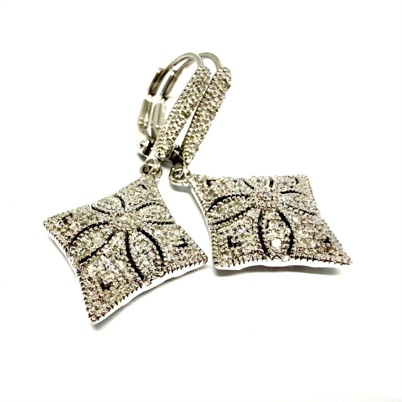 Půvabné, závěsné náušnice novodobě zhotovené ve stylu Art deco. Náušnice byly zhotoveny ze stříbra ryzosti 925/1000, o celkové váze 4,15 g. Každou z náušnic zdobí 24 drobných diamantů. Délka 3,4 cm. Perfektní stav.