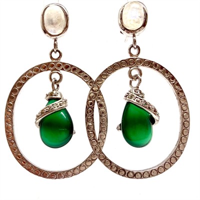 Výrazné, efektní, stříbrné náušnice se zapínáním na puzetu. Náušnice zdobí v horní částí měsíční kámen a středový, kinetický ověs s ostře zeleným chalcedonem vybroušeným do tvaru kapky. Sterlingové stříbro (925/1000), celková váha 13,38 g. Délka 5 cm, průměr oválu cca 3 cm. Perfektní stav.