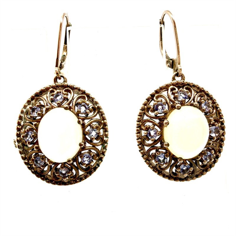 Půvabné, závěsné náušnice. Zhotoveny ze zlaceného stříbra sterlingové ryzosti (925/1000). Celková váha 7,85 g. Náušnice jsou na středu osazeny měsíčním kamenem hladkého brusu kabošon, po obvodu 8 tanzanitů. Délka 3,4 cm. Perfektní stav.