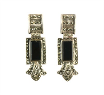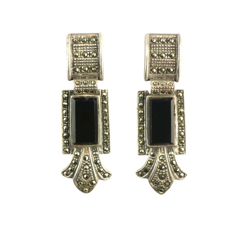 Náušnice ze stříbra ryzosti 925/1000 zdobené onyxy. Rozměry náušnic 4,5 x 2,0 cm. Celková hmotnost 12,76 g.