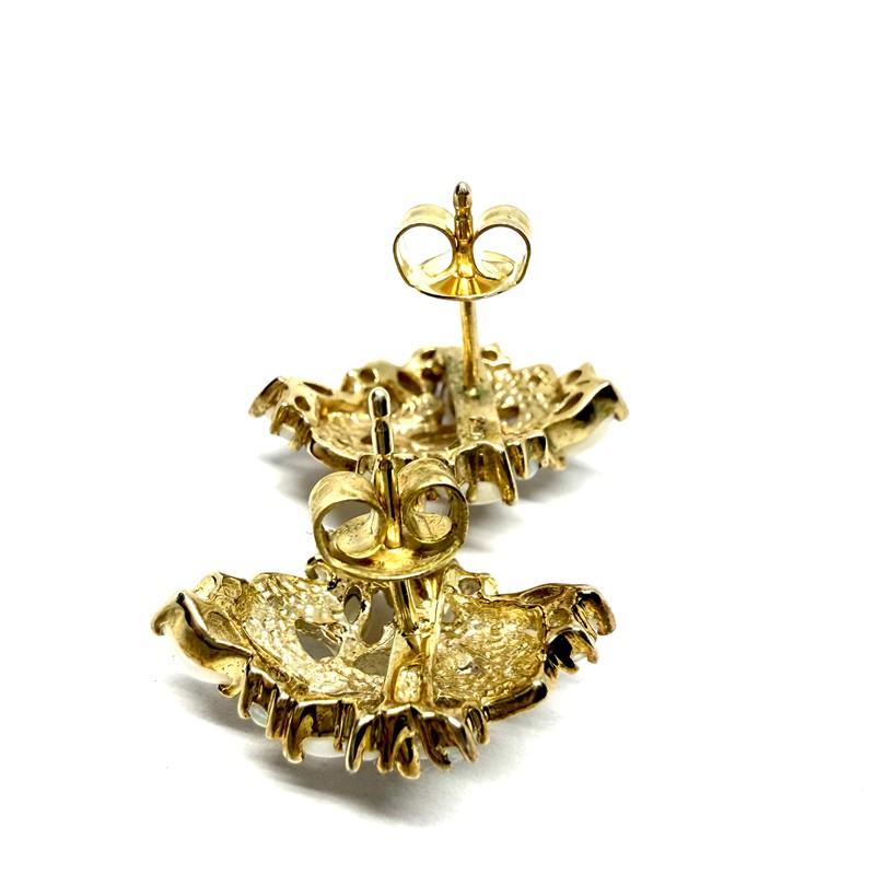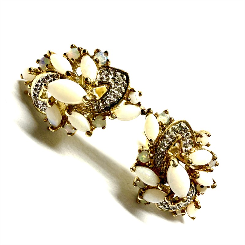 Elegantní, efektní náušnice ze zlaceného stříbra. Bohatě zdobeny světlými opály s červánkovou opalizací. Sterlingové stříbro (925/1000). Celková váha 4,54 g. Perfektní stav.