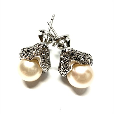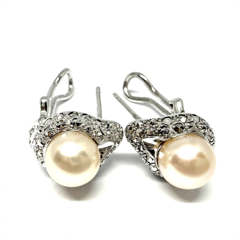 Elegantní, stříbrné náušnice s důmyslným klapkovým zapínáním. Náušnice zdobí perla krémového odstínu, vyznačující se vysokým leskem. Průměr cca 7 mm. Perlu rámují elegantně se třpytící markazity. Náušnice byly zhotoveny ze sterlingového stříbra (925/1000) a jsou označeny ryzostní, autorskou a puncovní značkou. Celková váha 10,14 g. Příjemně nositelný šperk v perfektním stavu.