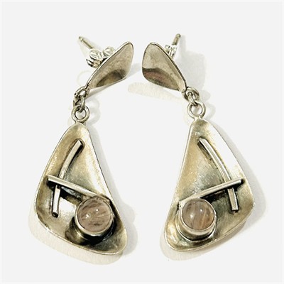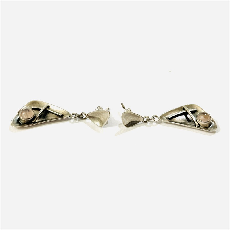 Elegantní, vkusné náušnice v bruselském stylu, ověsek i čelo u zapínání typického buněčného tvaru, miskovitá plocha s kulatou muglí přírodního inkludovaného růženínu, prostorově výraznější zakřivené linie. Patrně severoevropská ateliérová práce z 60. let 20. století. Zhotoveno z nezlaceného stříbra o ryzosti 925/1000; nově opatřeno puncem S-61 (kozlík 2) na dřících. Hmotnost 4,36 g, celková délka 41 mm, šířka 16 mm. Zapínání formou nových puzet, ponecháno s přirozenou patinou, lze vyčistit, celkově v zachovalém stavu.