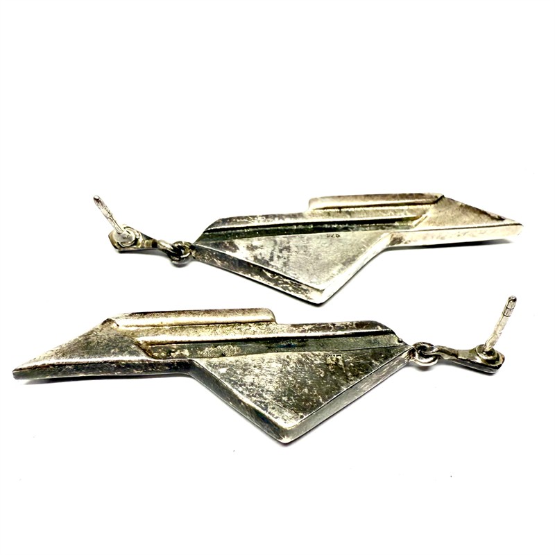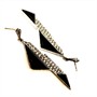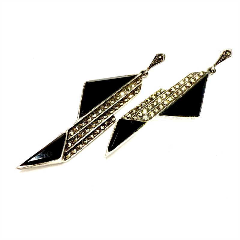 Výrazné náušnice zhotovené ve stylu Art deco ze stříbra. Zdobeno černým onyxem a velkým množstvím elegantně se třpytících markazitů. Sterlingové stříbro (925/1000), celková váha 9,57 g. Délka 5 cm, zapínání na puzetu. Výborný stav.