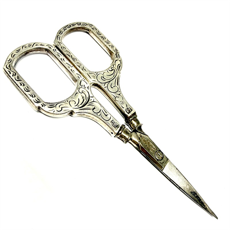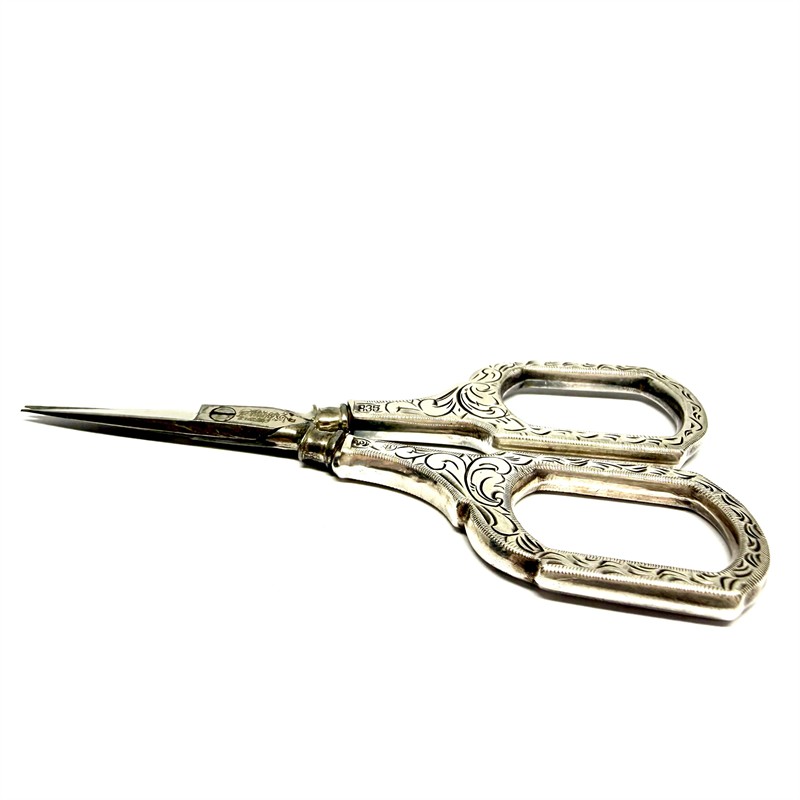 Malebné, stříbrné nůžky. Rukojeť nůžek zdobí bohaté, precizní, ruční rytí a je vyrobena ze stříbra ryzosti 835/1000. Ocelové čepele značeny Solingen. Celková váha 14,23 g. Rozměry 8,5 x 4,5 cm. Nůžky jsou plně funkční a ve výborném stavu.