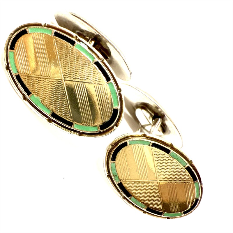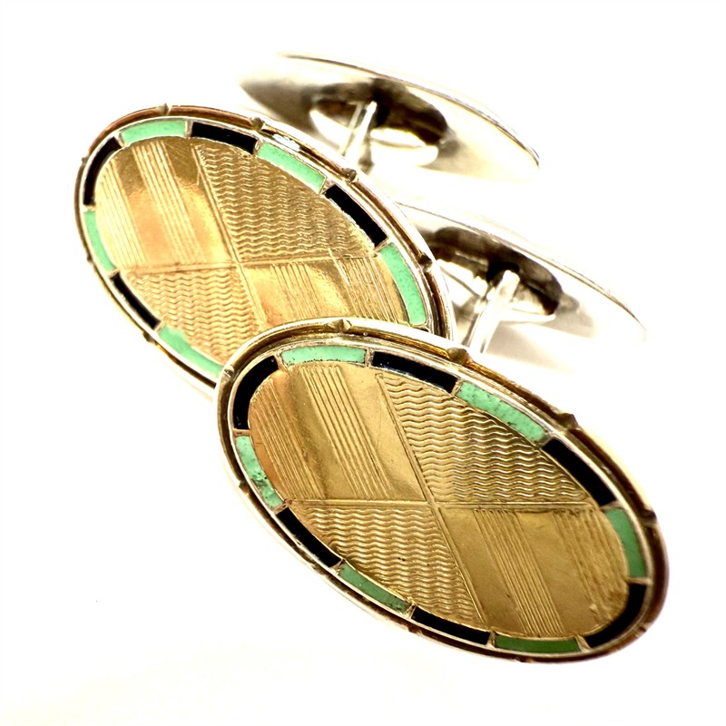 Elegantní manžetové knoflíčky ze zlaceného stříbra zhotovené v první polovině 20.století ve stylu Art deco. Stříbro ryzosti 800/1000, celková váha 7,21 g. Zdobeno jemným Art deco ornamentem a smaltovou obrubou. Ryzostní, autorská a puncovní značka. Výborný stav.