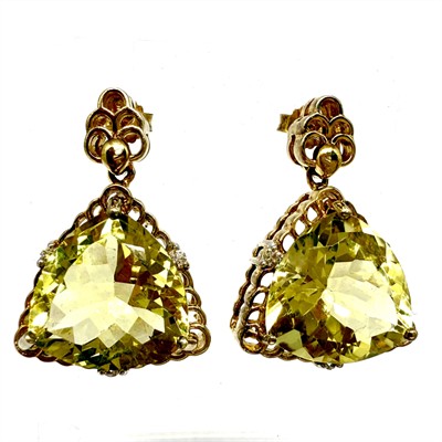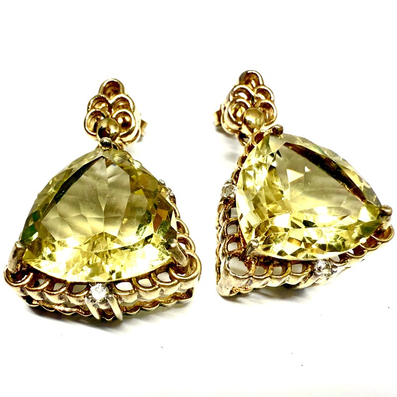Výrazné, honosné náušnice ze zlaceného stříbra se zapínáním na puzetu. Sterlingové stříbro (925/1000), celková váha 14,06 g. Náušnicím dominuje velký, fazetově vybroušený citrín zasazený do třech krapen. Délka cca 3 cm. Profesionálně vyčištěno zlatníkem, perfektní stav.