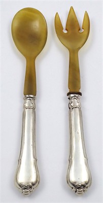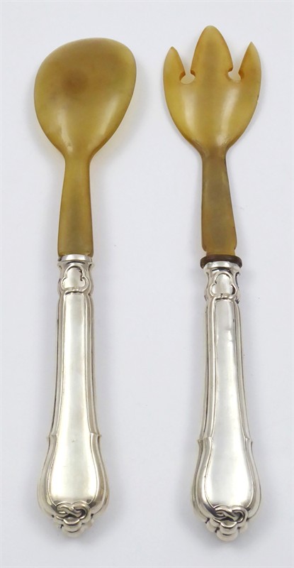 Stříbro, rohovina. Ryzost Ag 750/1000, celková hmotnost 150,35 g. Přiloženo osvědčení Puncovního úřadu České republiky. Příbory na salát se stříbrnou rukojetí zdobenou reliéfními linkami, pletenci a symbolem trojlistu. Horní části z rohoviny. Značeno: ryzost 750. Německo 1870 - 1900. Délka vidlice 26,5 cm, délka lžíce 25,5 cm.