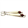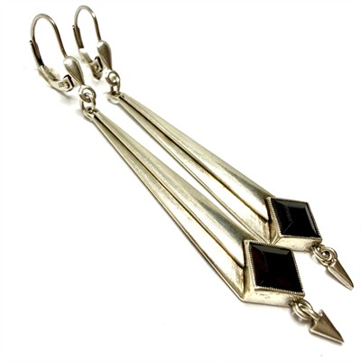 Půvabné, závěsné stříbrné náušnice z období první republiky. Náušnice byly zhotoveny ze stříbra kombinovaných ryzostí 800/1000 a 835/1000. Náušnice zdobí tmavý granát čtvercového tvaru. Celková váha 6,53 g. Délka cca 6,5 cm. Profesionálně vyčištěno. Perfektní stav.